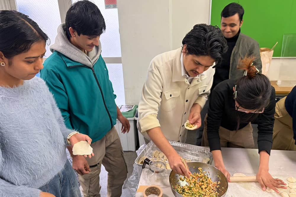 ネパールのお正月は4月ですが,今回はネパールや他の国からの留学生たちも餃子作りに挑戦。教えてもらいながら,一生懸命餃子を包みます。
