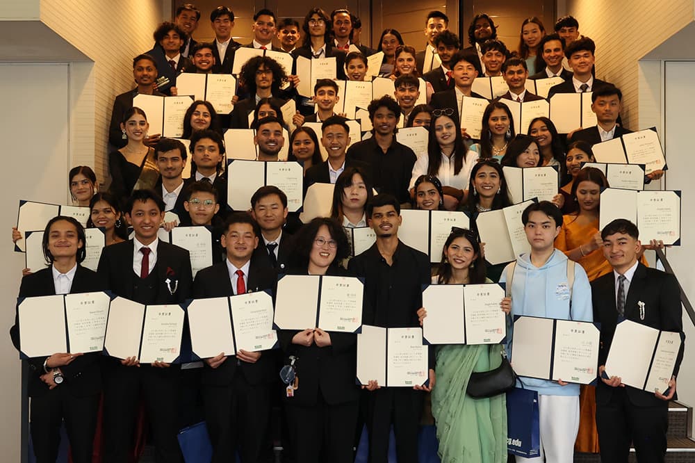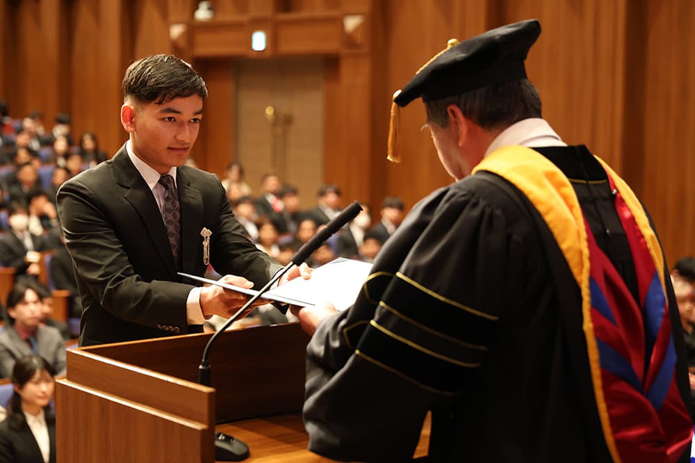 寺下陽一KCGI学長は式辞で,「みなさんが技術者として今後の社会を担っていくうえで重要なのは,技術と社会との関係に対し,的確な倫理観をもって向き合うことです。政治や外交の問題など,判断の難しい要素もありますが,自らの立ち位置を見極めながら,できる限り的確な倫理的判断ができるよう常に心がけていただきたい」と要望。そして今日の厳しい世界情勢に言及し,「本学での学びは,非常に多様な国際環境の中で行われています。こうした経験は,みなさんのこれからの人生において,極めて重要な財産となるはずです。国際的な問題に直面し,悩むことがあれば,本学での国際的な経験を思い出してください」と励ましました。