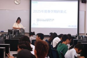 修了・卒業の辞を,第一部でKCGIの青柳さん,第二部でKCG情報工学科の林さんが述べました。KCGグループで学んだ技術や知識,経験を活かし,社会に出てからも学ぶ姿勢を持ち続け,予想される困難を乗り越えていく決意を表明しました。